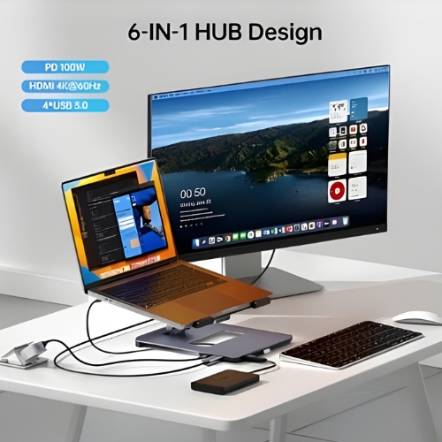 - Space-Saving Design: Combines stand and hub into one sleek unit, reducing clutter on your desk.