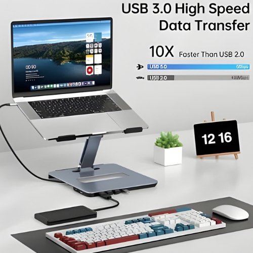 Elevate your workspace with the BENFEI Laptop Stand, a multifunctional accessory that combines ergonomic comfort with powerful connectivity. Designed for modern professionals, this stand integrates a 6-in-1 USB-C docking station, giving you seamless access to external displays, peripherals, and fast charging—all in one compact solution.
