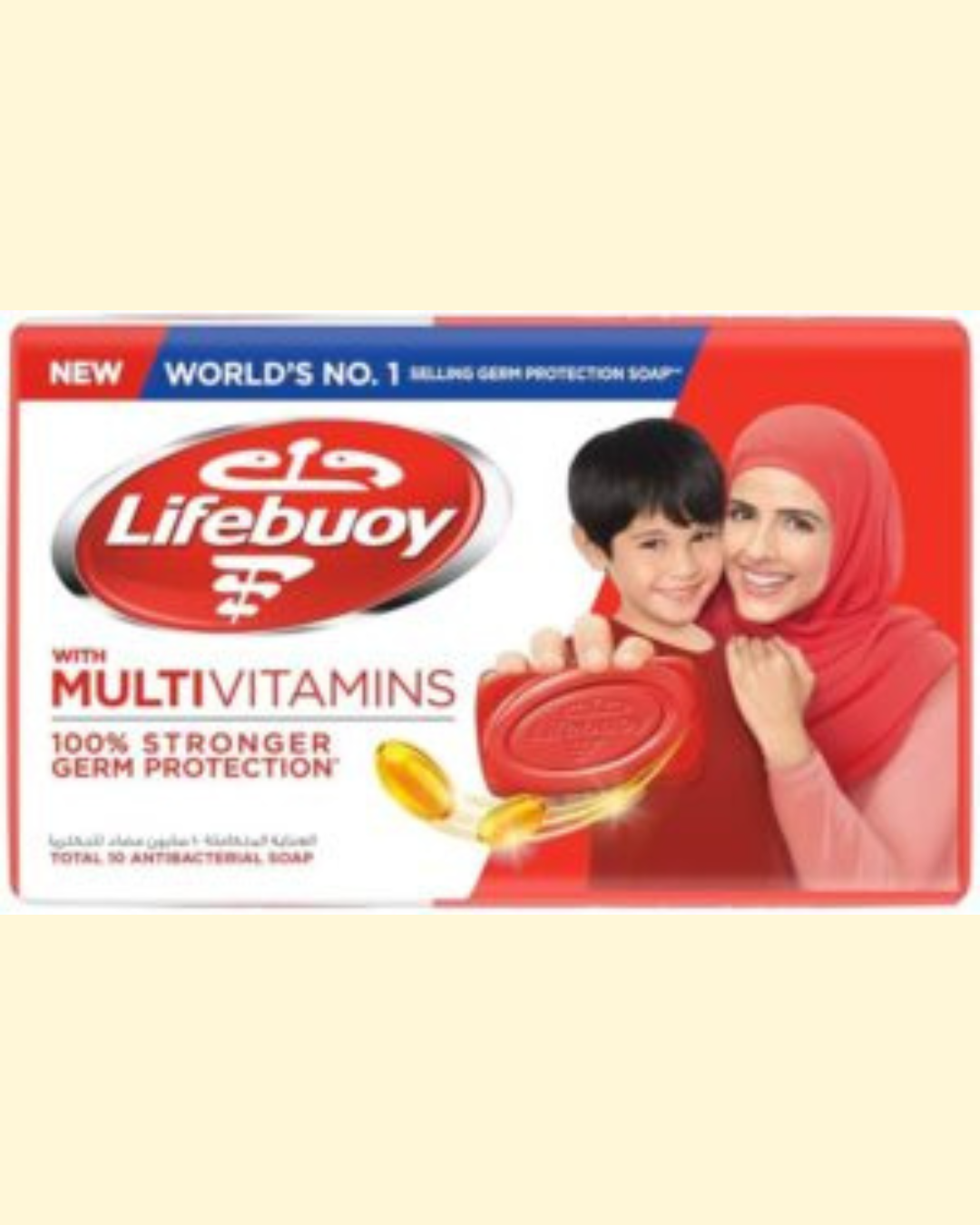 Protect yourself and your loved ones every day with an antibacterial bar soap, powered by a new multivitamin formula that gives you 100 percent stronger germ protection and promotes good hygiene for the whole family. Lifebuoy’s antibacterial soap has been dermatologically tested to ensure it’s safe for you and your family. This bar soap is suitable for all skin types, including sensitive skin. Discover Lifebuoy’s best antibacterial soap for using in the bath or shower to deeply cleanse the body all over, or for use as part of regular handwashing throughout the day. It foams up under running water in seconds, making your skin feel instantly fresh and clean after each use. Moisturising ingredients like glycerine help maintain your natural balance, supporting your skin barrier while nourishing at the same time. To use, rub this bar soap onto a damp wash cloth, or between your palms if you’re using it as a hand soap, then rinse well before drying off and following with hydrating skin care products. Lifebuoy is the world’s no.1 germ protection soap, trusted by families everywhere. Explore more Total 10 products and other germ-protecting Lifebuoy ranges now. As per lab test on indicator organism vs ordinary soap without actives