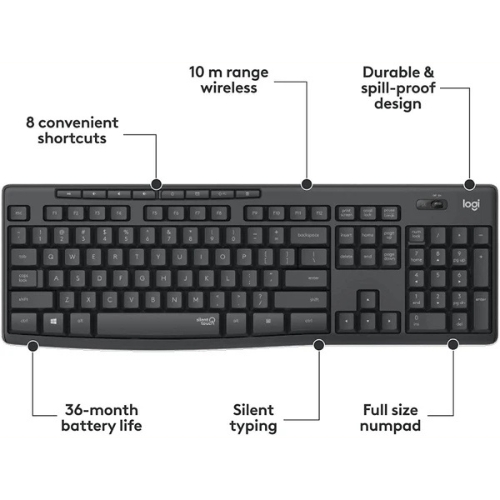 Stay focused on your work and cut out distractions. Meet Logitech MK295 Silent Wireless Combo featuring SilentTouch—an exclusive Logitech technology that eliminates over 90% of keyboard and mouse noise. It’s the same clicking and typing feel of the world’s bestselling combo without disruptive clicking and typing sounds.