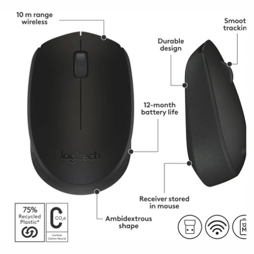 Upgrade your workspace with the Logitech M171 Wireless Mouse for reliable, hassle-free performance in a sleek, black finish.