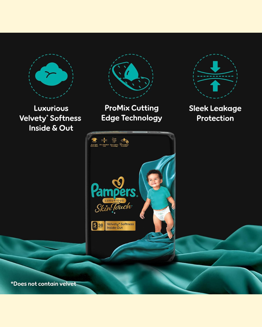 Introducing Pampers Luxurious Skin Touch, our most advanced premium diaper designed to embody the comforting embrace of a mother’s hug. Crafted from luxurious, velvety* soft materials, these premium diapers wrap your baby in gentle, cushiony comfort, safeguarding their delicate skin both inside and out. With our innovative ProMix Cutting-Edge Technology and a super-soft elastic back, these diapers flexibly adapt to your baby’s movements, ensuring maximum comfort. Each diaper features ultra-absorbent layers that swiftly lock away liquid, providing up to 100% leakage protection. The super soft, stretchy waistband adapts to your baby’s growing range of movements and supports walking milestones, while our advanced odor-locking technology keeps unpleasant smells at bay for long lasting freshness. Plus, Pampers Luxurious Skin Touch Premium Diapers are free from parabens, chlorine, and latex, offering the gentle care your baby’s delicate skin deserves. *does not contain velvet