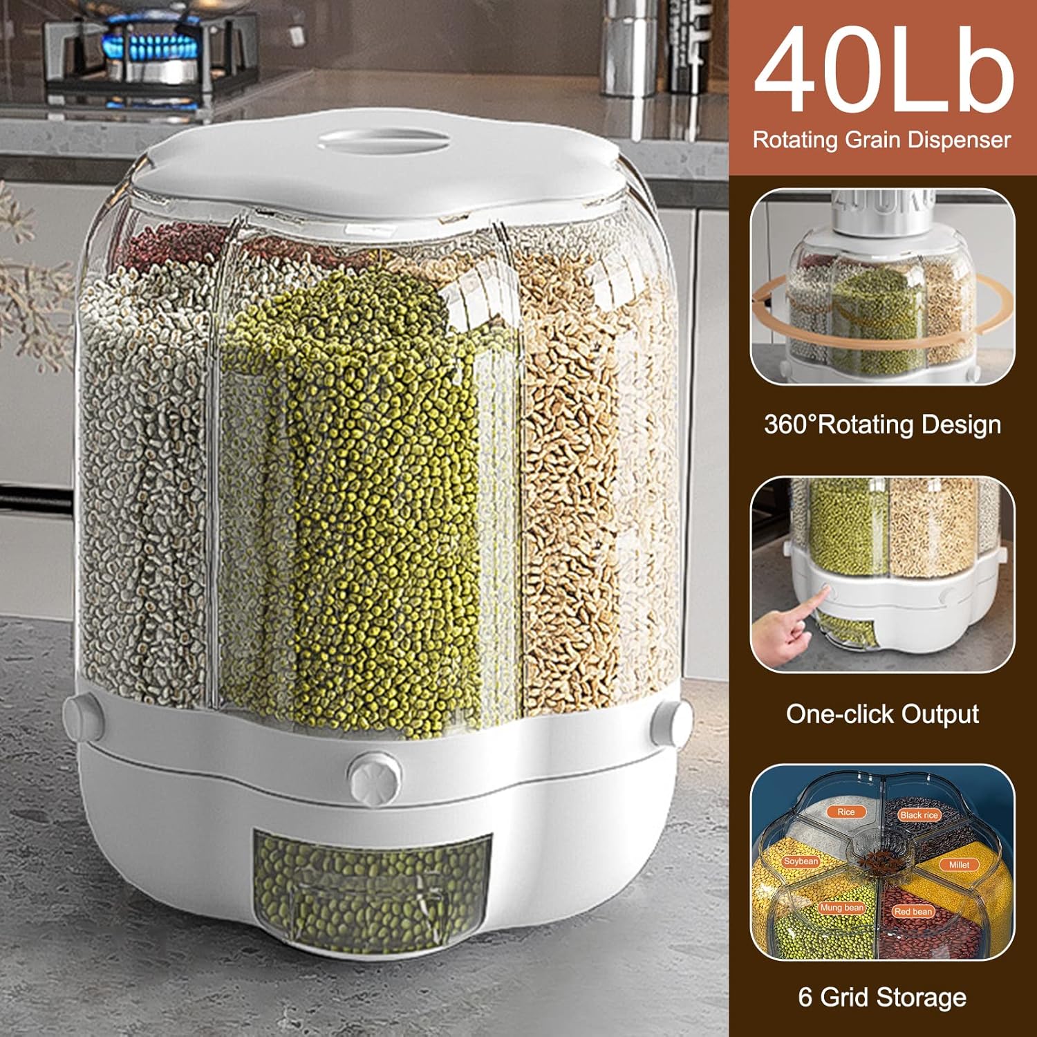 - 【6-in-1 Auto Rice Dispenser】Our rice storage container has a 40lbs capacity of dry food (The actual storage capacity is about 30lb), can store up to 6 different dry foods,keep your kitchen looking organized.