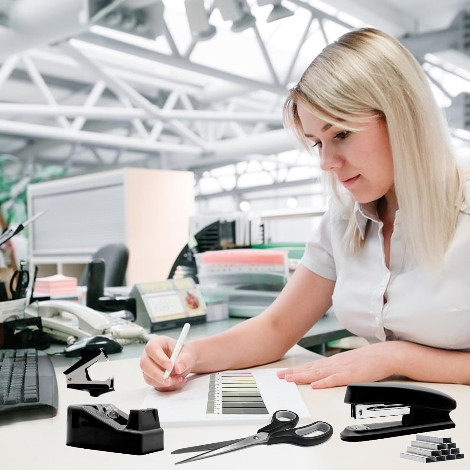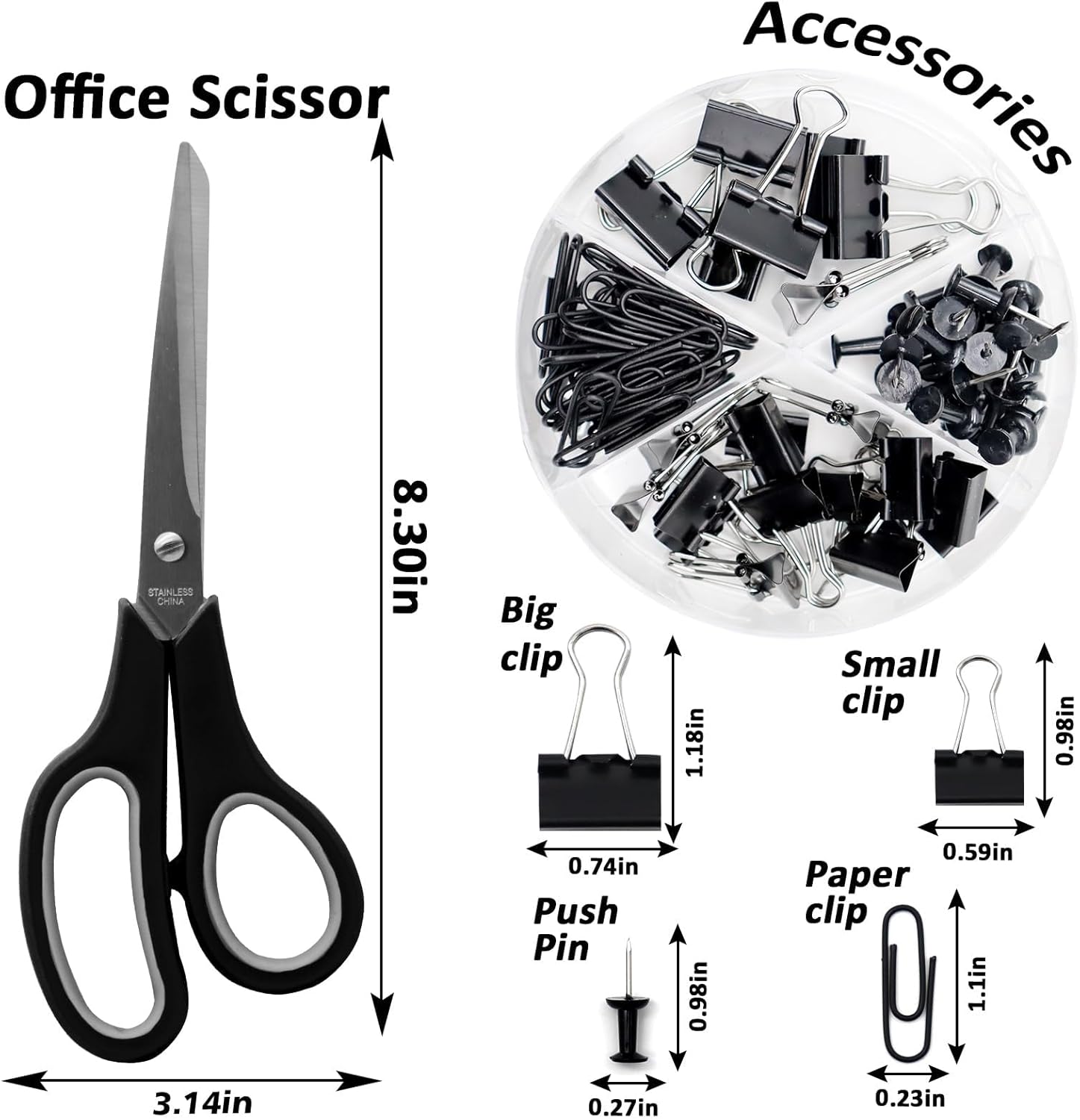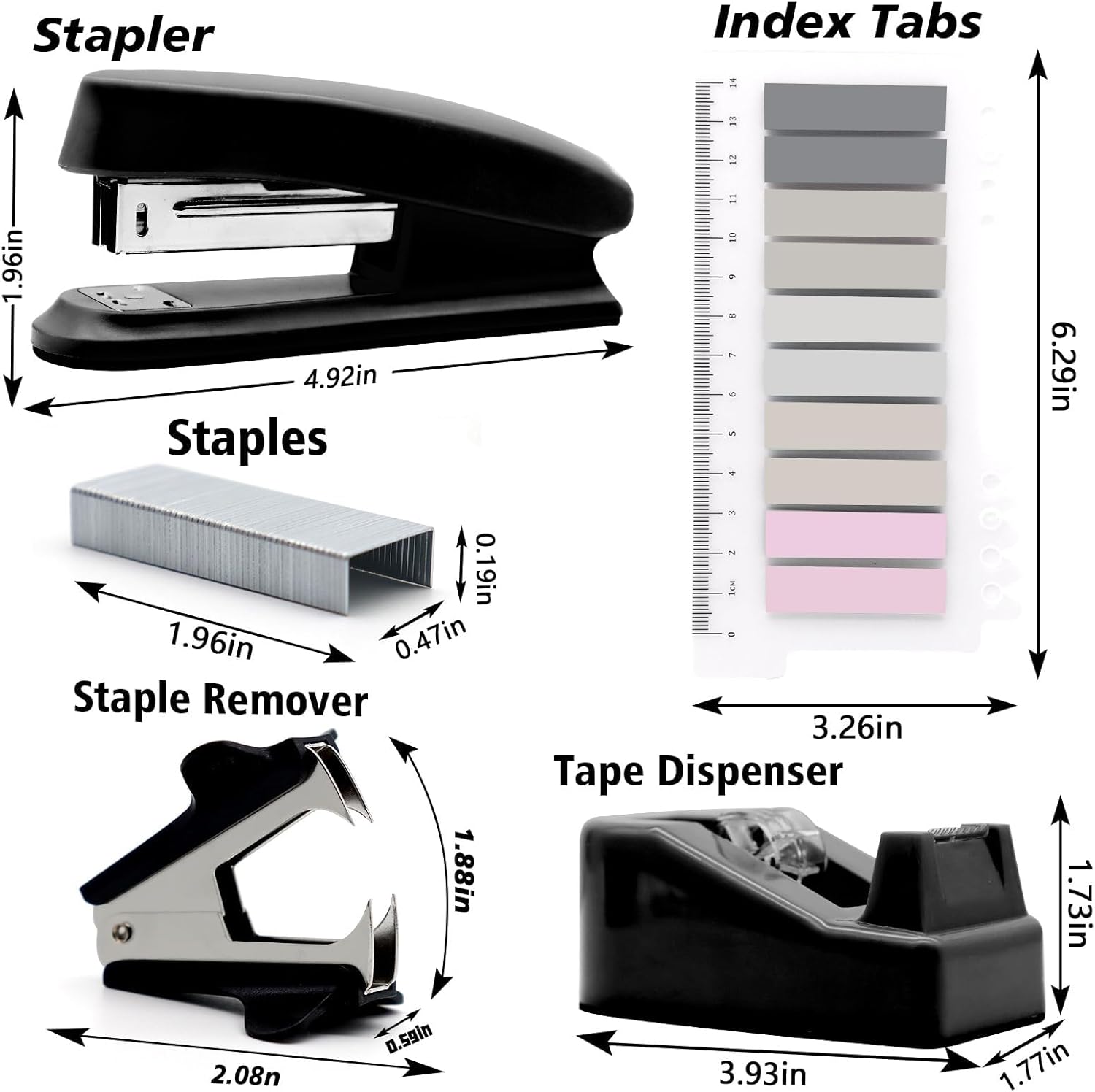 - 【Package Includes】 This black office supplies contains 1x Black Stapler, 1x Black Staple Remover, 1000x Staples, 1x Black Tape Dispenser, 1x Office Scissor, 20 x Push pins 7 x Big Clips 15 x Small Clips 30 x Paper Clips, 10 Colors Tabs.