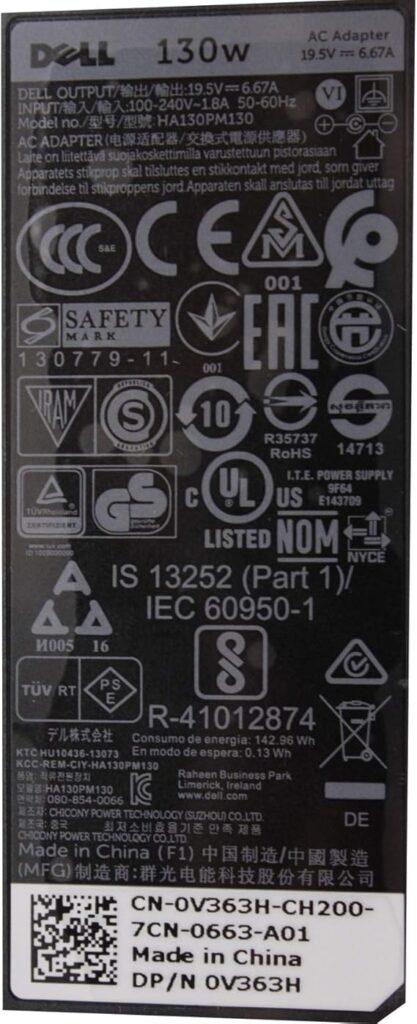 Specifications. Device Type: Laptop Power Adapter. Power Transformer: 130 Watt *** Input voltage: 100~240V -1.8A 50/60Hz ** Output: 19.5V 6.67A ** Power Capacity: 130W (Max) **