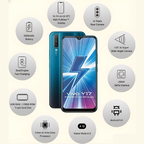 The Vivo Y17 is an ideal choice for users seeking reliable performance and a feature-packed experience. This dual-SIM smartphone comes with ample storage and smooth multitasking capabilities, featuring $4\text{GB}$ of installed RAM memory and $128\text{GB}$ of internal memory storage. Presented in a striking Blue finish, the Vivo Y17 ensures you have plenty of space for your apps, media, and photos. The device is properly packaged, ensuring it arrives safely and ready for immediate use.