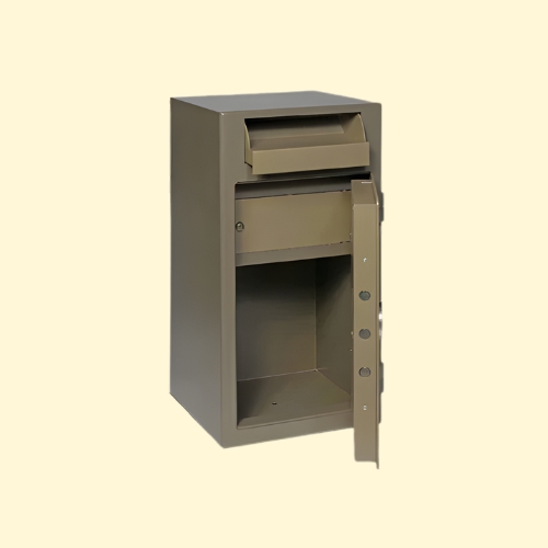 Secure high volumes of cash and valuables with this heavy-duty, front-loading deposit safe. Engineered for maximum protection, it features 5mm thick steel walls and a 5mm front panel, certified to Class H0 burglary-resistance (GOST R 50862-2005). The unit is equipped with a world-class Digital Lock by Kaba Mauer (Germany) and a 3-bolt live-locking system to thwart unauthorized entry. Its specialized anti-“fish” internal construction ensures that once deposits are made, they remain inaccessible from the outside. With a substantial 78kg weight and a large 109-liter capacity, this brown hammer-effect safe is the ultimate security choice for busy retail environments and commercial offices.