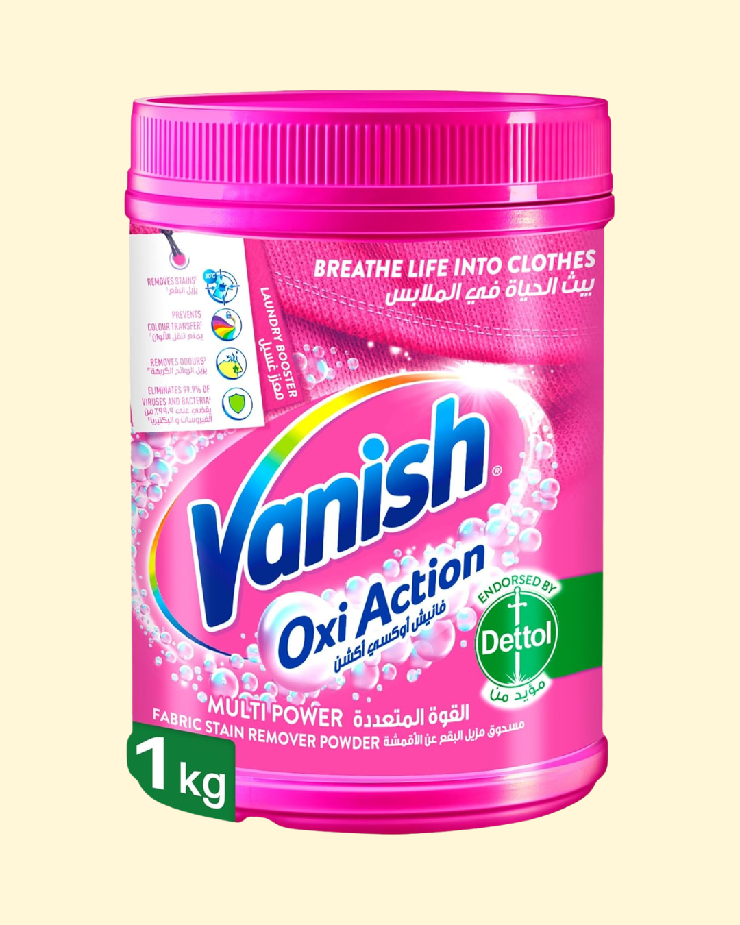 Breathe life into clothes. Beat all those stains from your coloured and white clothes with Vanish Oxi Action Powder. Vanish Oxi Powder safely removes tough dried stains, like grease, chocolate, or coffee, that detergents alone cannot remove. It’s Oxi formula contains colour care & helpers like dye transfer inhibitors that prevent colour runs for enhanced brightness and cellulase to smoothen damaged fibres, making colours brighter. With Vanish Oxi Powder stain remover, you can feel at ease knowing your stains and dirt is safely removed while still keeping your coloured clothes protected and whites brighter.