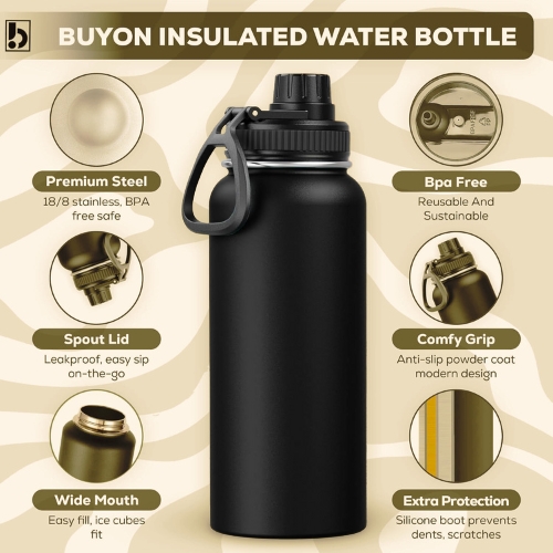 • 🟦【SPOUT LID DESIGN】BuyOn insulated hydro bottles come with Spout Lid to meet your requirements, made of high quality BPA free plastic and a twist off cap. Both are leak proof and easy to drink make hydration easier.
